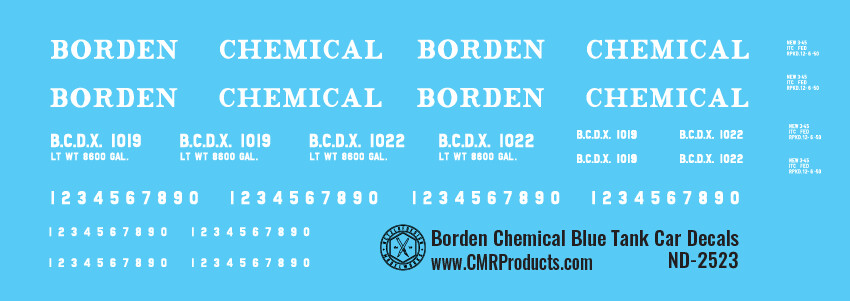 Set includes Logos, lettering, and labels to model two Borden Chemical Cars.